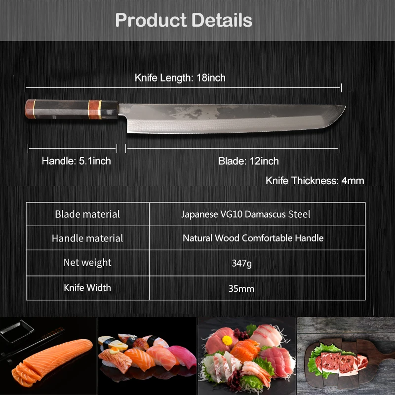 Product Name: 12inch Japanese Sashimi Sushi Kitchen Knife Vg10 Damascus Steel Scabbard Japan Chef Sushi Salmon Fish Filleting Knives 4.1G+
